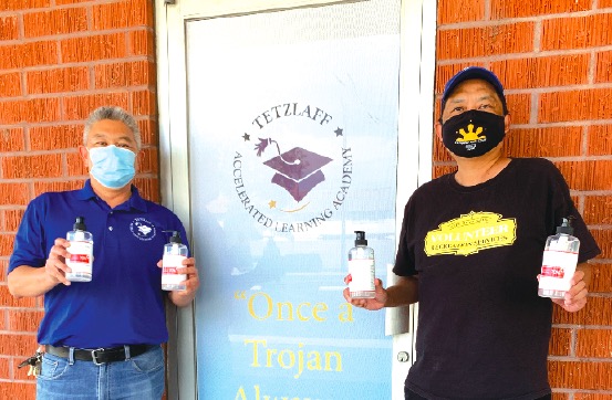 DURING THE CLOSING WEEKS of the school year, Cerritos Councilman Frank Yokoyama delivered boxes of hand sanitizer bottles to Nixon Academy and Tetzlaff Academy; Yokoyama is seen here with AP Mr. Hamamura.