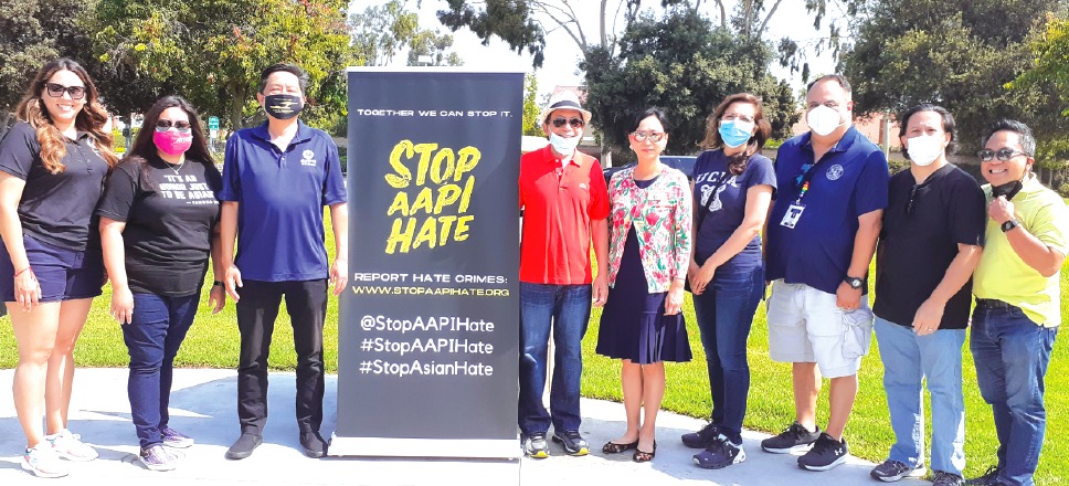 STOP HATE: Local elected officials gathered to protest Asian-Pacific Islander violence in general while also lending support to Cesar Echano (red shirt), the 70-year-old Filipino-American who, along with his wife, were verbally and physically assaulted during an outing at Don Knabe Community Regional Park.