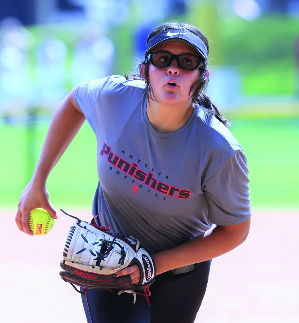 ARTESIA PUNISHERS 16-Under pitcher Sara Pinedo (El Modena High) was a workhorse during last weekend’s Champions Cup showcase tournament in Irvine. In the final four of six games the Punishers would play, Pinedo pitched 14.2 innings of the 20 the Punishers played during that time, gave up 15 hits, eight earned runs and struck out eight batters. PHOTO BY ARMANDO VARGAS, contributing photographer.