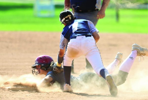 Morgan took off for second and appeared to have beat the throw from Cal A’s catcher Jessalyn Casillas. But five seconds after Morgan reached second, the field umpire called her out to end the game. PHOTO BY ARMANDO VARGAS, contributing photographer.