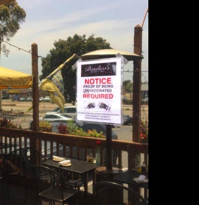 This week he took it a step further, putting up signs declaring, “Proof of being unvaccinated is required for entry.”