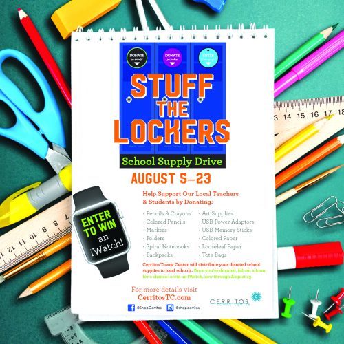 The Cerritos Towne Center, an open-air lifestyle center near Los Angeles, California (https://www.cerritostc.com), is hosting a “Stuff the Lockers” school supply drive. Guests are asked to help area students and teachers by donating pencils and crayons, colored pencils, markers, folders, spiral notebooks, backpacks, art supplies, USB power adaptors and memory sticks, colored paper, loose-leaf paper, and tote bags; donations can be dropped off at the locker in the Edwards Stadium 10 Courtyard from August 5th through August 23rd during regular business hours. Cerritos Towne Center will distribute the donated supplies to local area schools. After making a donation, Cerritos Towne Center shoppers can fill out a form for a chance to win an iWatch; the iWatch winner will be notified on August 30th. For more details, visit https://www.cerritostc.com.