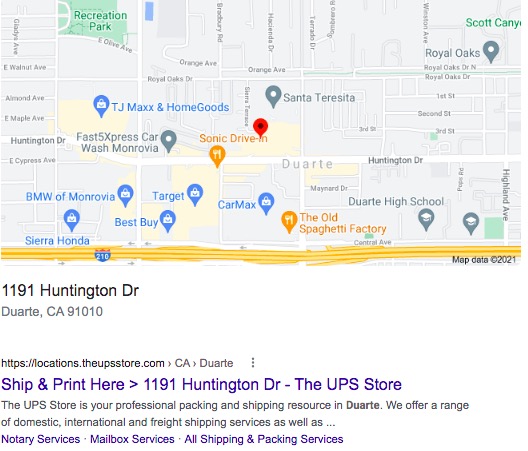 They used the address of 1191 Huntington Drive, #355, Duarte, California 91010, a P.O. Box in a UPS store.