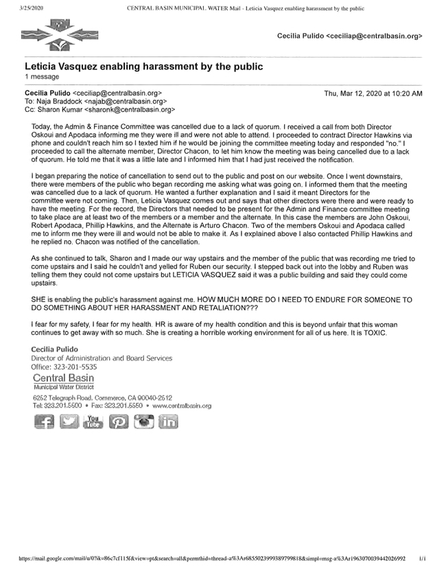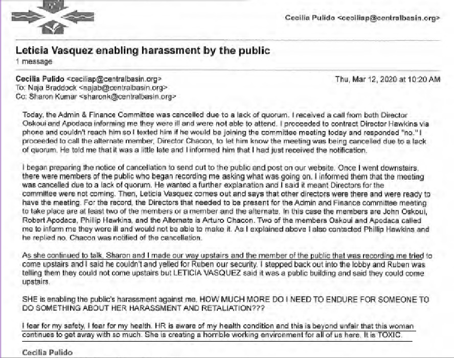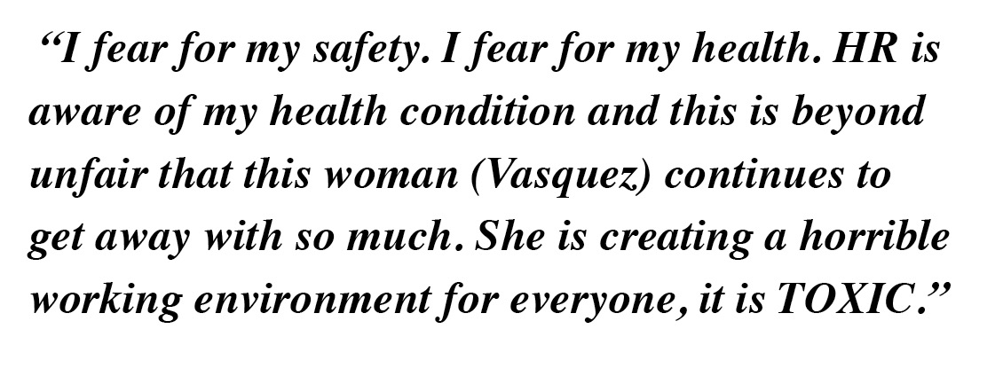 Pulido finished the email, “I fear for my safety. I fear for my health. HR is aware of my health condition and this is beyond unfair that this woman (Vasquez) continues to get away with so much.”