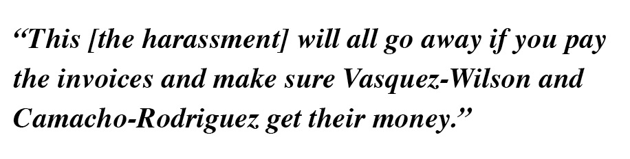 Rojas later rejected the invoices, with Vasquez-Wilson and Camacho-Rodriguez, along with Cortes and Martinez, subjecting Rojas to private and public harassment “until he paid the invoices.”