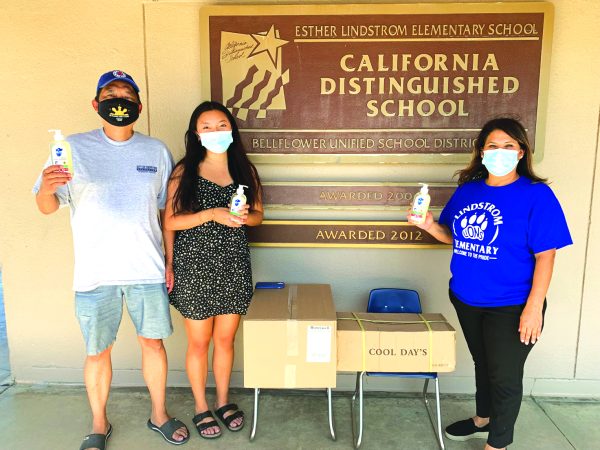 COUNCILMAN FRANK YOKOYAMA with his daughter delivered boxes of face masks and hand sanitizer bottles to Lindstrom Elementary School. With them is Principal Olga Rios, who is also on the ABC School Board.