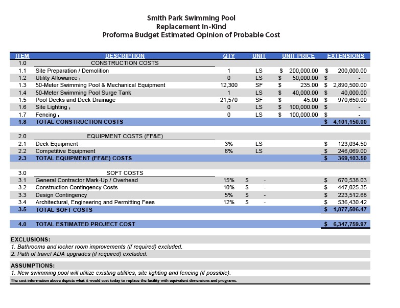 ADG described those repairs “for a new swimming pool with the same dimensions as the existing swimming pool with new mechanical and chemical equipment. Any replacements would be designed and constructed to current code standards, but once again the cost excludes the new bathhouse and ADA entry.