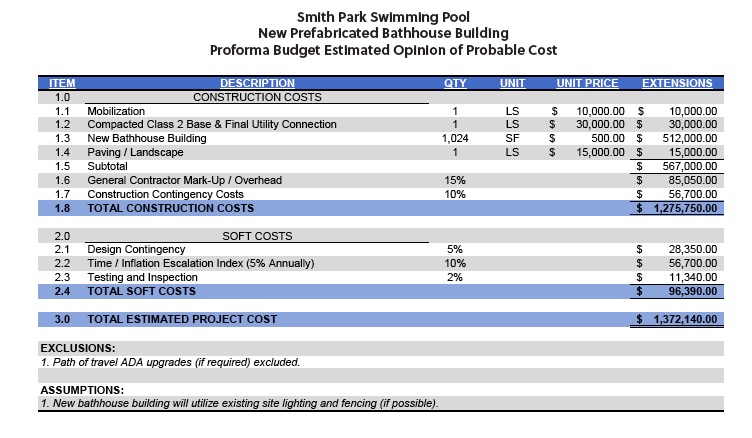 Proforma budget to provide a bathhouse at nearly $1.4 million.