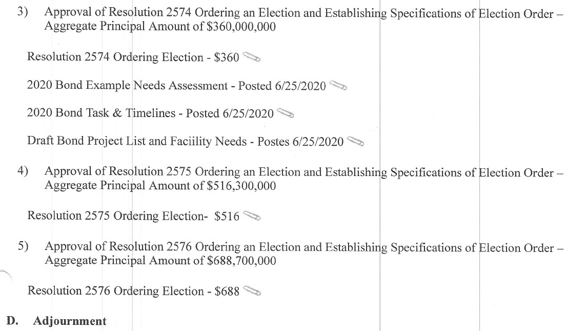 The official meeting minutes show the Board passed two: one for $360 million, Resolution 2574; and another for $516 million, Resolution 2575; according to the minutes, the $360 million bond passed 7-0; the second 5 to 2.