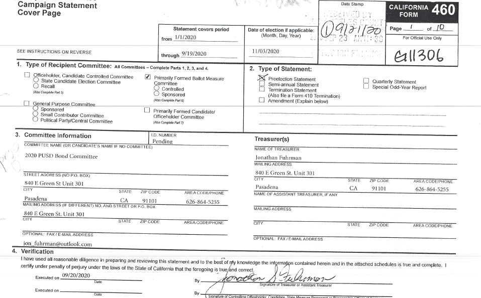 But the “2020 PUSD Bond Committee” documents showed Jonathan S. Fuhrman as the lone treasurer, and on one else.