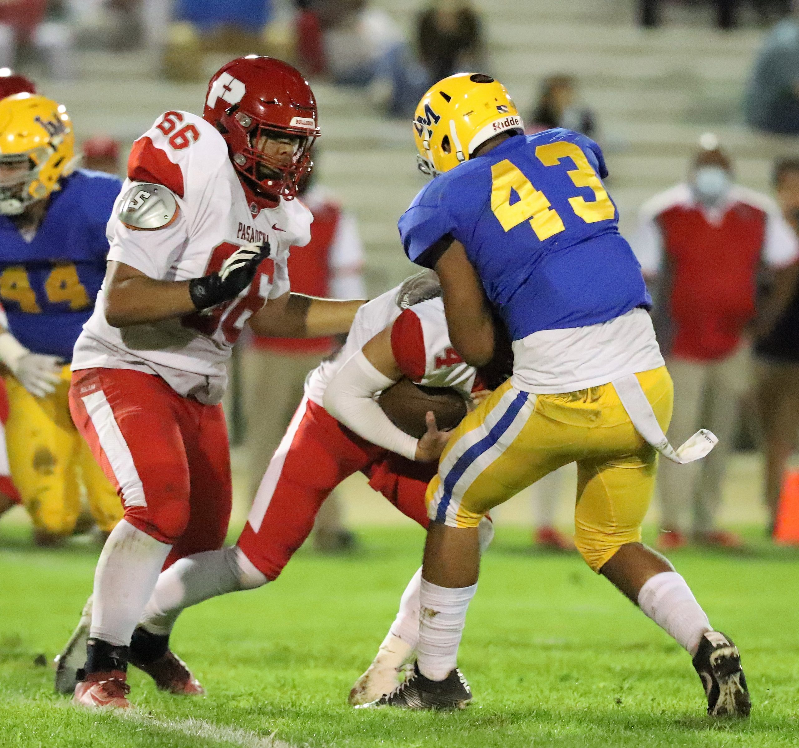 La Mirada High senior defensive lineman Josh Aiono stops Pasadena High quarterback Kaden Taylor in last Friday night’s CIF-Southern Section Division 7 quarterfinal game. Taylor gained 27 yards on the ground as he helped his Bulldogs knock off La Mirada 41-31. PHOTO BY ARMANDO VARGAS, Contributing photographer.