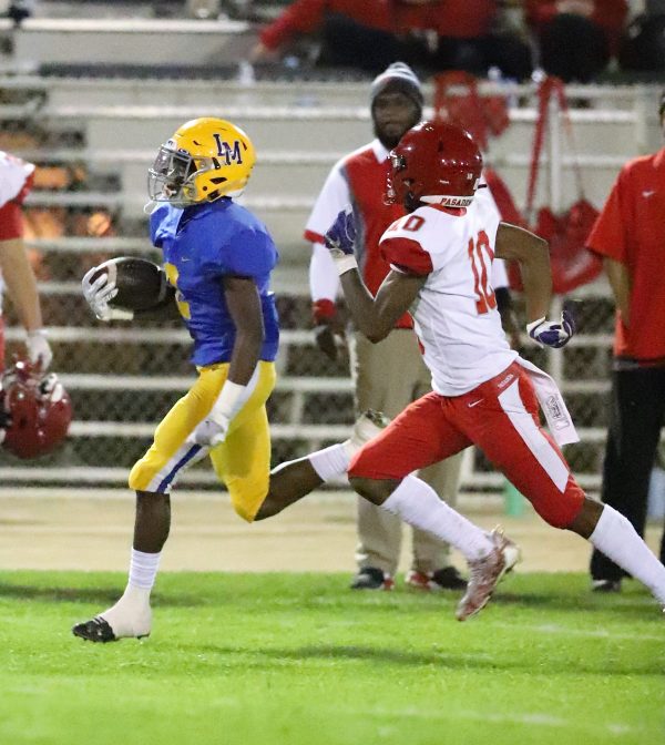 La Mirada High senior running back Amel White is off to the races down the Pasadena High sideline as Cameron Mitchell tries to catch up in last Friday night’s CIF-Southern Section Division 7 quarterfinal game. White gained a game-high 105 yards on 10 carries but the Matadores fell to the Bulldogs 41-31. PHOTO BY ARMANDO VARGAS, Contributing photographer.