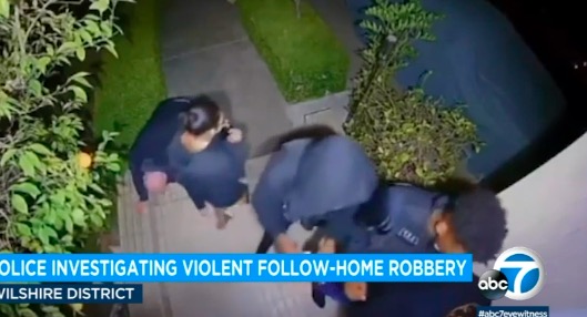LOS ANGELES (KABC) — Footage from a recent follow-home robbery in a Los Angeles neighborhood shows two suspects use a pistol to threaten three people and then assault one of the victims.