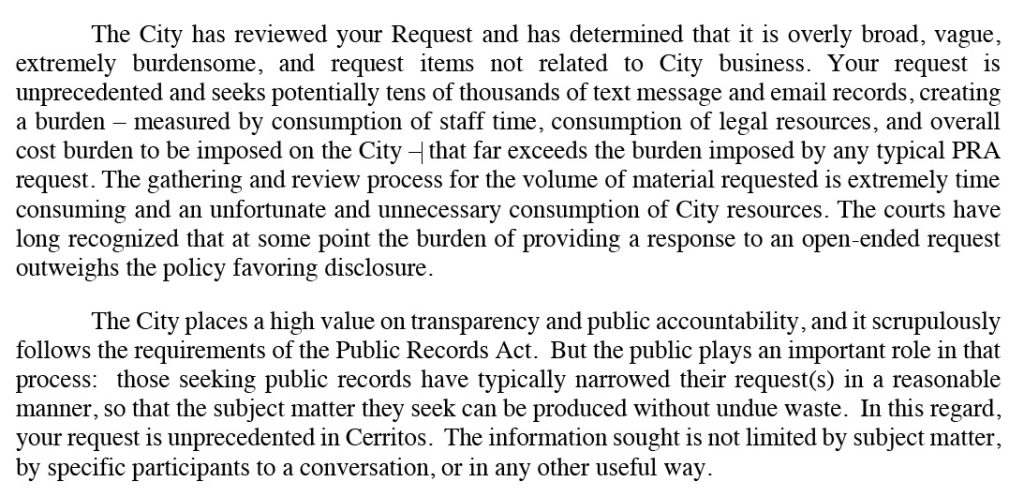 A few days later, HMG-CN sent a public records request to the Cerritos City Clerk on Dec. 9, 2021, asking for Vo’s text messages for one year and his personal emails for two years.