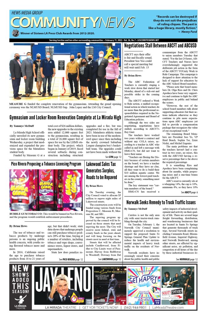 Hyper local award winning weekly community newspaper group: Cerritos news, Artesia news, Hawaiian Gardens news, Norwalk news, Lakewood news, La Mirada news, Pico Rivera news, La Palma news, Commerce news, Bellflower news, Montebello news, Whittier news