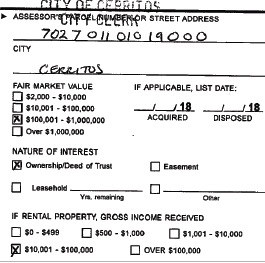 PAGE FROM VO’S Statement of Economic Interests filed with Cerritos showing his second rental home property in Cerritos. Zillow estimates the rent would be nearly $4,000 per month and that the house is worth $1.2 million.