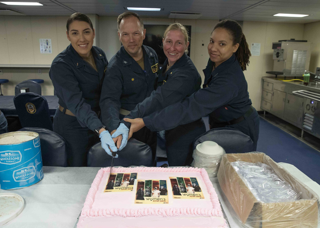 ATLANTIC OCEAN (March 30, 2022) – Capt. Michael Concannon, commanding officer of the Expeditionary Sea Base USS Hershel “Woody” Williams (ESB 4), center left, cuts a ceremonial cake with Lt. j.g Lauren Schindel, registered nurse, left, from Pico Rivera, California, Lt. Alexis Tomlin, registered nurse, center right, from Kansas City, and Information Systems Technician 1st Class Shaunte Fraizer, from Hampton, Virginia, in celebration of Women’s History Month, March 30, 2022. Hershel “Woody” Williams is on a scheduled deployment in the U.S. Sixth Fleet area of operations in support of U.S. national interests and security in Europe and Africa. (U.S. Navy photo by Mass Communication Specialist 1st Class Fred Gray IV/Released)