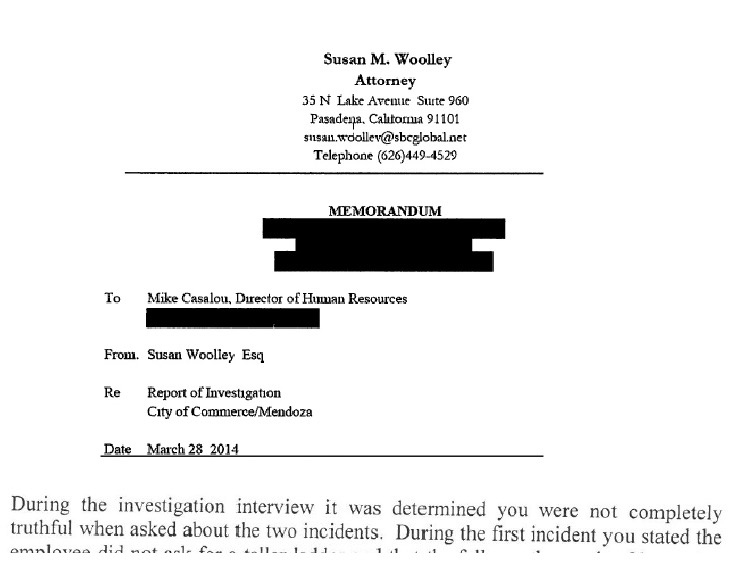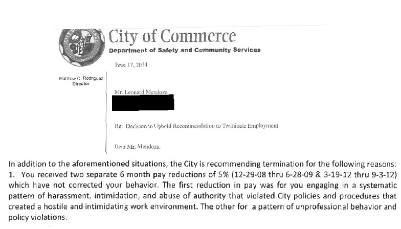 Varios documentos obtenidos por Hews Media Group-Community News muestran que Mendoza fue despedido de su trabajo en la ciudad de Commerce por acoso sistemático, intimidación, peleas e ignorar las políticas de seguridad que resultaron en lesiones graves a sus trabajadores.
