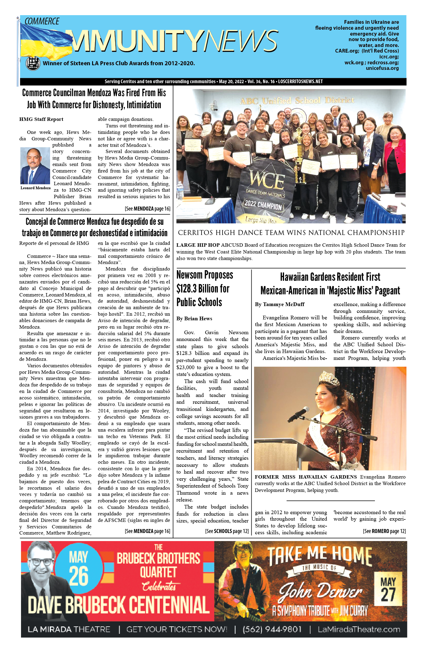 Award-winning HMG-CN is a  hyper -local community news and investigative reporting print newspaper in Los Angeles and Orange Counties.  Covering Cerritos, Artesia, Hawaiian Gardens, Lakewood, Norwalk, La Mirada Lamplighter Community Newspaper, La Palma, Commerce, Downey, Bellflower, Pico Rivera.