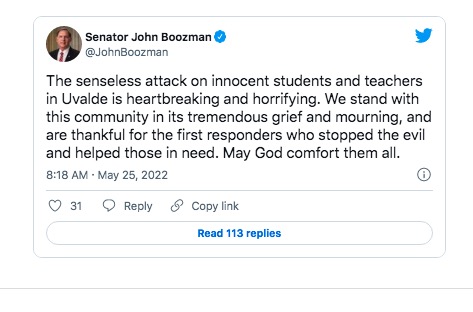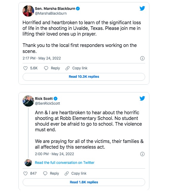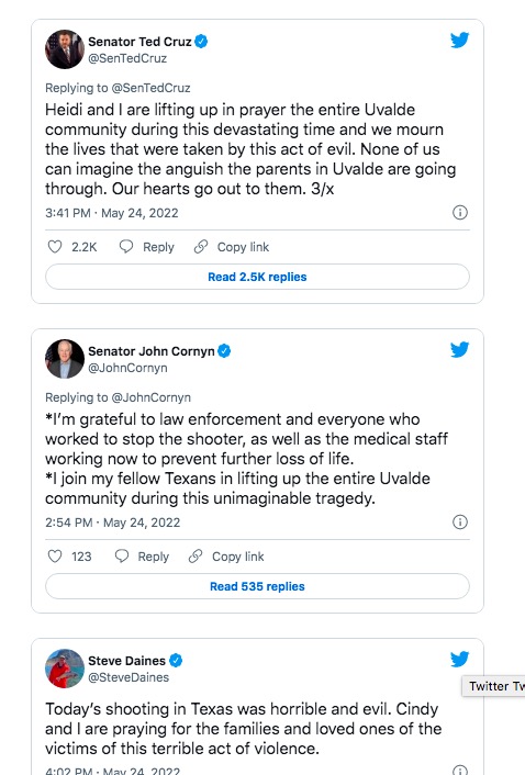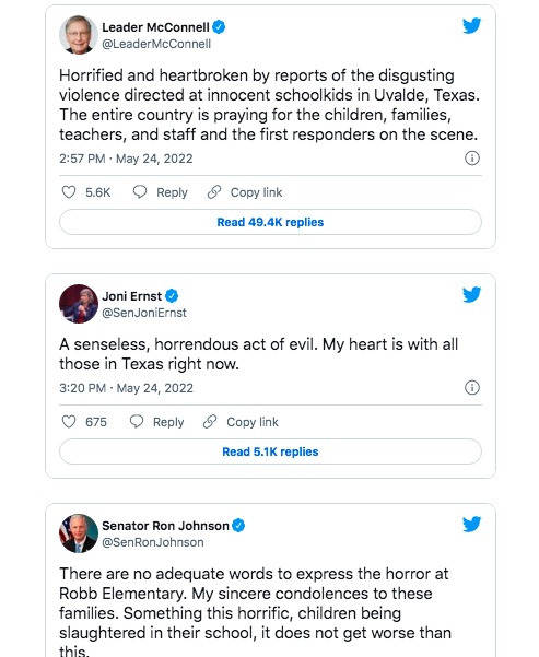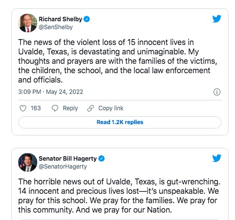May 26,2022-(HUFF POST) Republican senators stood united Wednesday in response to the shooting massacre at a Texas elementary school that left 19 children and two teachers dead, making it clear that they have a plan for what they can ― and must ― do in response to these largely preventable and routine mass shootings happening all over the country, all the time.