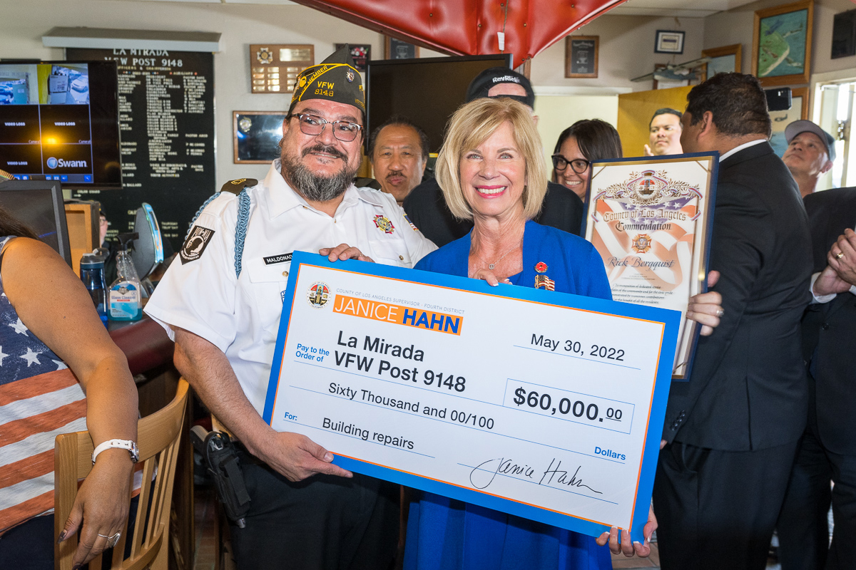 May 31, 2022~La Mirada, CA – This week, after attending Memorial Day events in Whittier and Pico Rivera, Los Angeles County Supervisor Janice Hahn stopped by VFW Post 9148 in La Mirada where she presented a $60,000 check from her office to the organization to help pay for building repairs.
