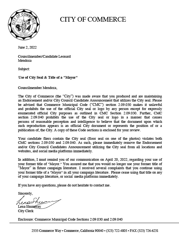 Shumway was forced to write a letter to Mendoza on June 2, 2022, obtained by HMG-CN, outlining his violations and demanding him to cease using the City Seal and calling himself mayor on campaign materials.