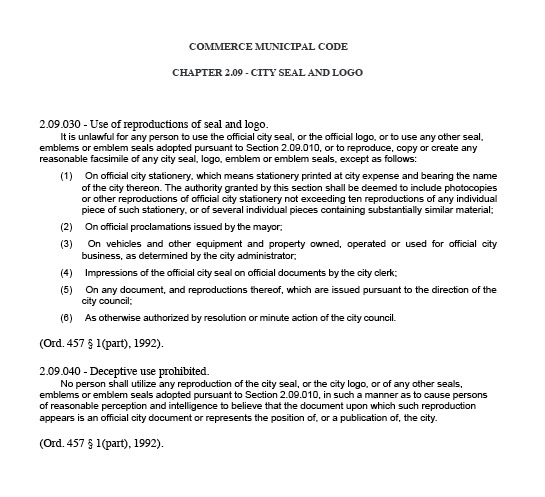 “Please be advised that Commerce Municipal Code (“CMC”) section 2.09.030 makes it unlawful and prohibits the use of the official City Seal or logo by any person.