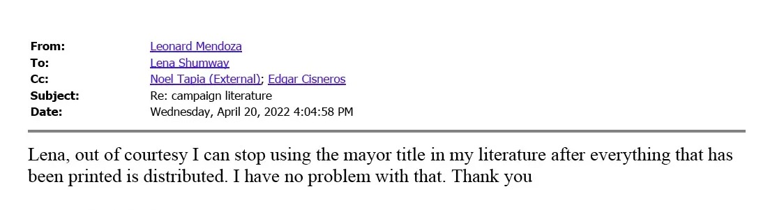 On April 20, 2022, Shumway sent a letter regarding Mendoza’s illegal use of his former title of mayor; Mendoza wrote back and assured Shumway he would stop; that was six weeks ago.