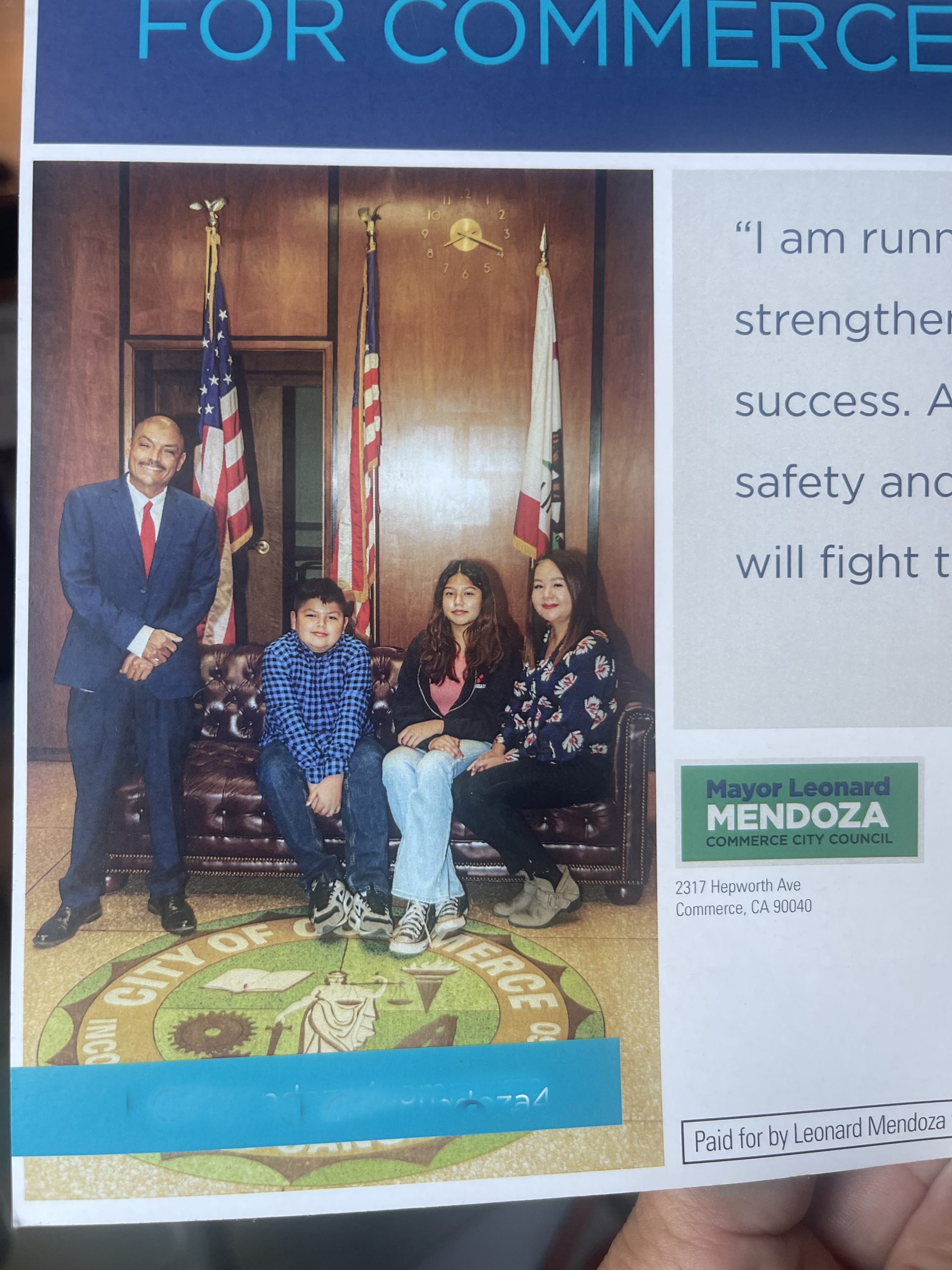 A campaign flyer mailed out by Mendoza last week clearly showing the city seal (on the rug). He also calls himself “Mayor Leonard Mendoza.” Both are violations he was warned about by the Commerce City Clerk.