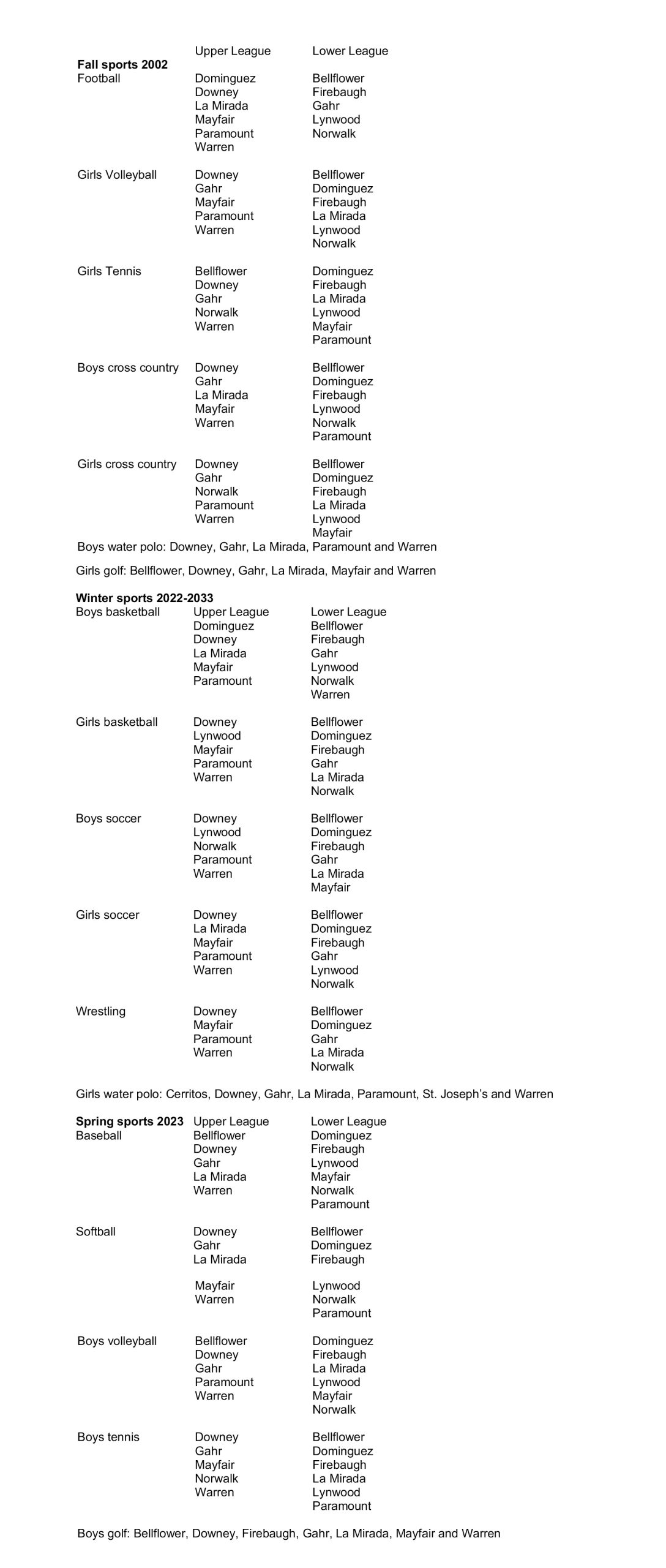 When the football season begins, the Upper League will consist of Dominguez High, Downey, La Mirada, Mayfair, Paramount High and Warren while the Lower League will field Bellflower, Firebaugh, Gahr, Lynwood High and Norwalk. Each year, teams could flip-flop leagues or stay where they are. For girls volleyball in the fall, the Upper League will have Downey, Gahr, Mayfair, Paramount and Warren, which have all been consistently dominant in their respective leagues. When the boys basketball season begins, Gahr will be in the Lower League, but that could be short-lived considering that the Gladiators have been historically a dominant program with very few sub-par seasons. Then when the 2023 spring season arrives, Gahr and La Mirada baseball will be new league rivals and play three times, scheduled for Mar. 28 at La Mirada, Mar. 30 at Gahr and Apr. 28 at La Mirada. Those two schools will also be in the Upper League for boys cross country and softball and will be Lower League rivals in girls basketball, boys soccer and wrestling.