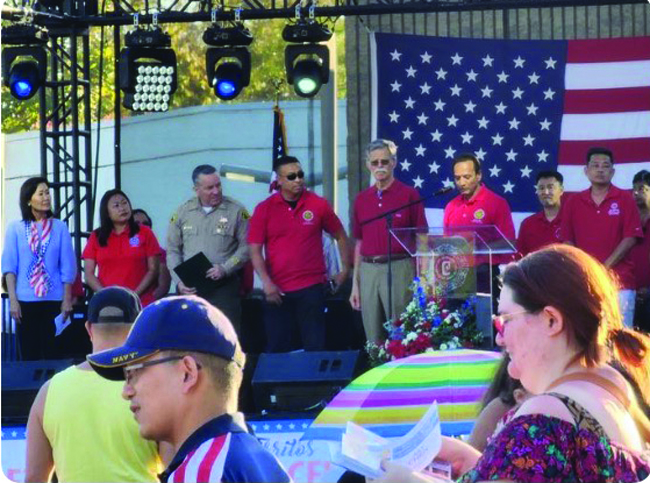 A good indication is the Republican-dominated council, this is a picture from Cerritos’ Fourth of July event yesterday. Democratic candidates Jay Chen and Kim Carr were not allowed on stage but Michelle Steele and Janet Nguyen were, far left.