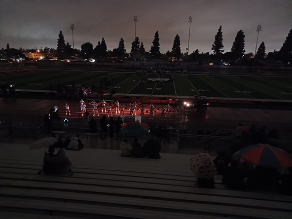 The power was knocked out during halftime and again in the middle of the second half of Artesia High’s football game against Marquez High last Friday night, but that didn’t stop the Artesia cheerleaders from providing some entertainment. The game ended in a 21-21 tie. Photo by Loren Kopff.