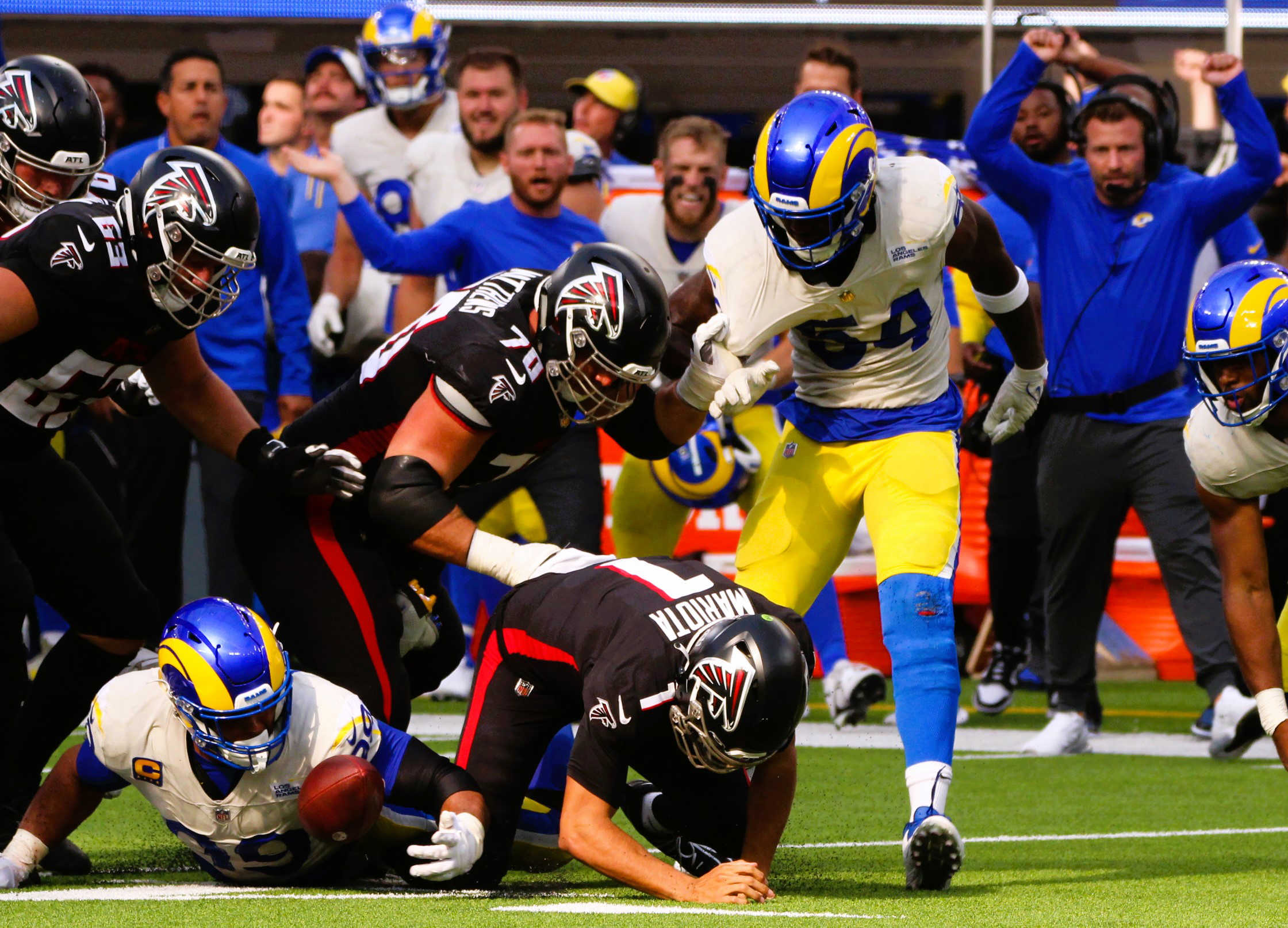 INGLEWOOD, Calif. – Wide receiver Allen Robinson II scored his first touchdown as a Ram, rookie defensive back Cobie Durant snagged his first career interception and first career sack, and wide receiver Cooper Kupp had another monster game as the Rams (1-1) held on to defeat the Falcons 31-27 Sunday afternoon at SoFi Stadium. Aaron Donald and the Rams’ defense held the Falcons on the final few plays of the game. Seen above is Donald recovering a Falcon’s fumble as Coach Sean McVay (back right) cheers him on.