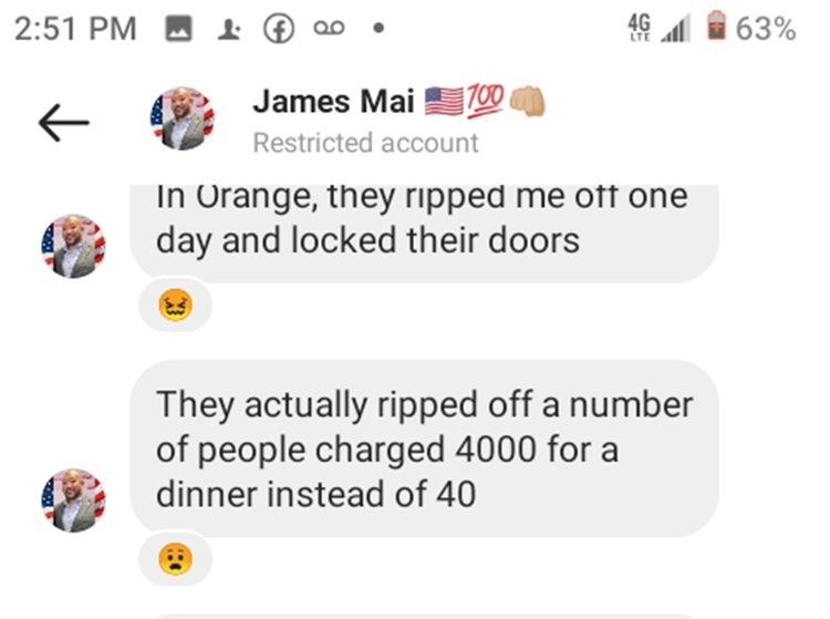 In May 2022, according to the blog, Mai dined at an Indian restaurant, posting on his Instagram account soon after he left that the restaurant overcharged him.