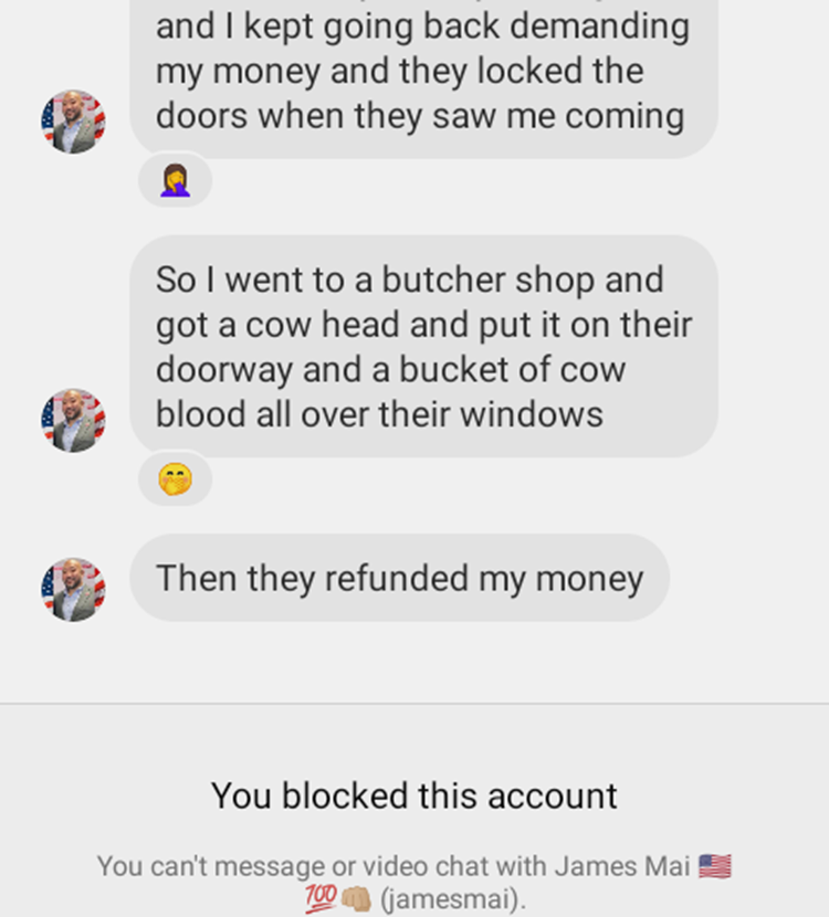 Inferring that the owners of the Indian restaurant were possibly Hindu, Mai posted “I went to a butcher shop got a cow head and put it on their door, and a rubbed a bucket of cow blood over their window….. they refunded me the money.”