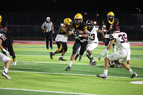 Cerritos High sophomore running back Kalib Moran cuts through the Troy High defense in last Thursday night’s 49-6 setback. Moran gained 77 yards on 14 carries and caught two passes from senior quarterback Dylan Burton for 16 yards. PHOTO COURTESY OF CERRITOS HIGH YEARBOOK STAFF.
