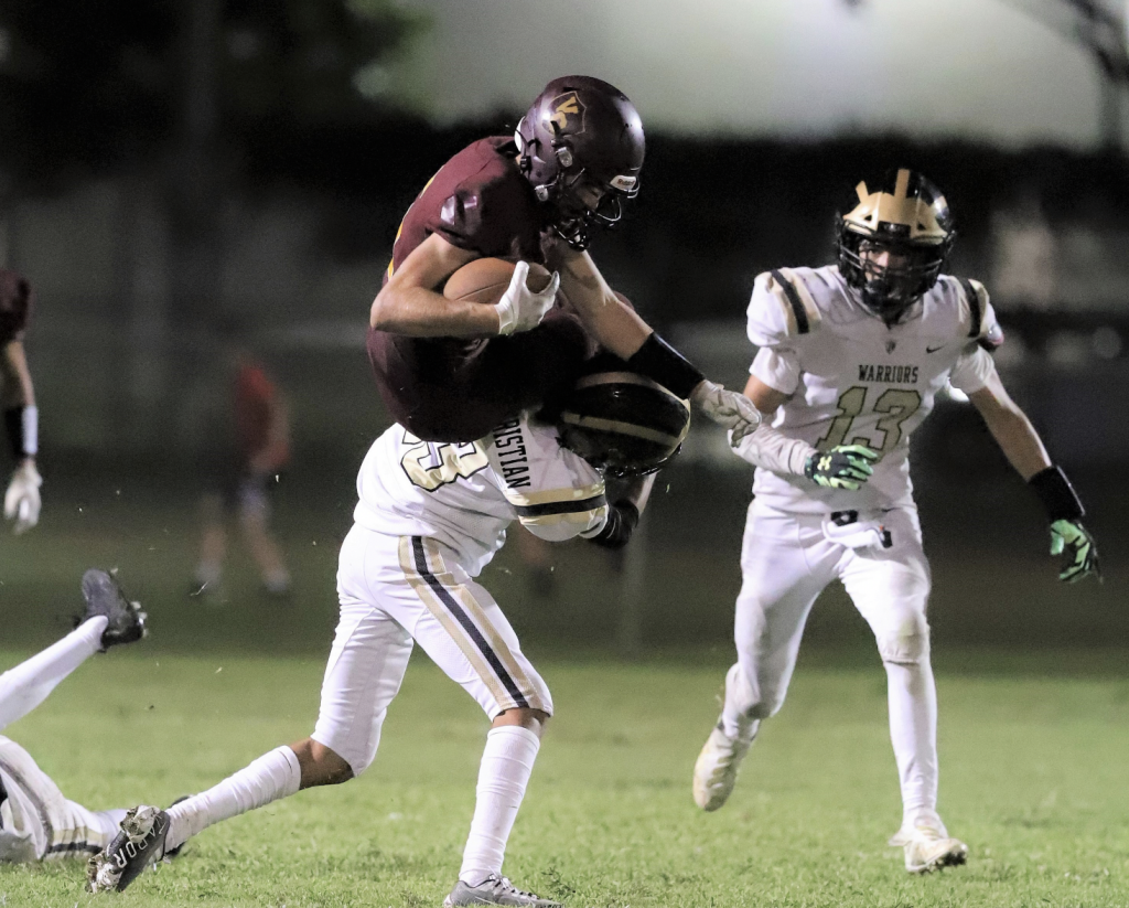 Valley Christian High senior Jaidon Carter returns a kickoff late in the third quarter as he tries to get past Rashas Shamburger (#4) and Austin Evans of Heritage Christian High in last Friday night’s Ironwood League opener. V.C. fell to the Warriors 29-21 and dropped to 2-4 on the season. PHOTO BY ARMANDO VARGAS, Contributing photographer.