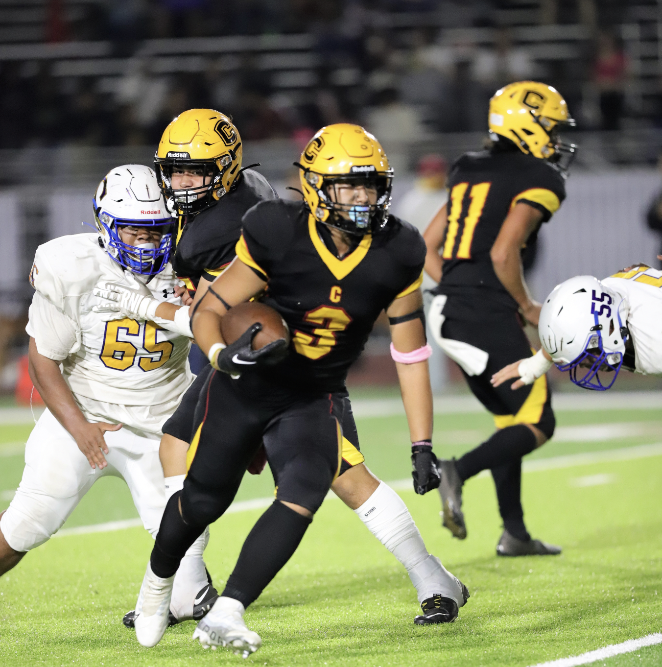 The Cerritos offense couldn’t generate much through the first three quarters, gaining 105 yards entering the final stanza. On the other side of the field, Gahr, which had 104 yards just in the first half alone, was limited to 69 yards in the second half and had its initial drive after halftime stall at the Cerritos 12-yard line.