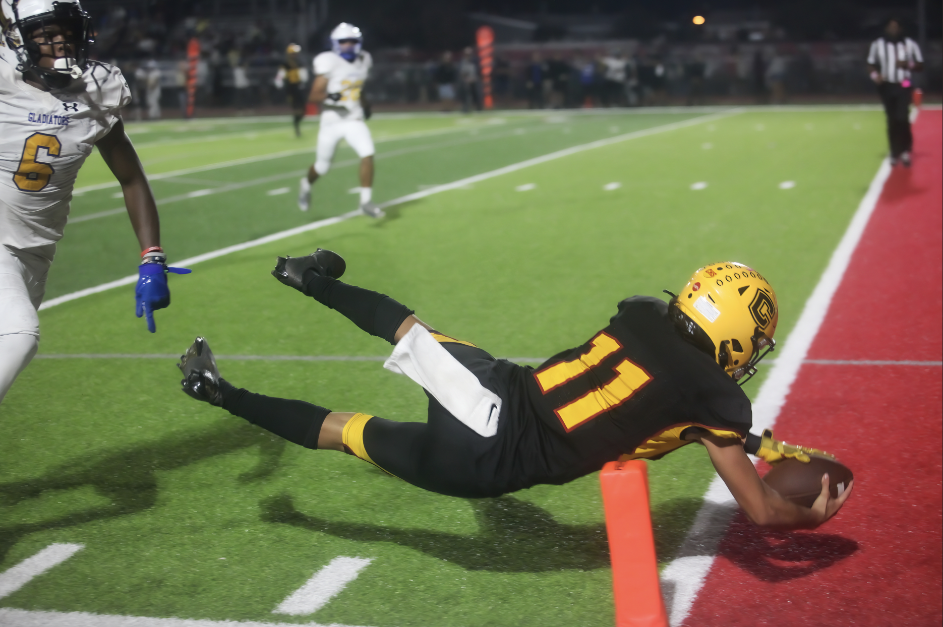 The lone touchdown for the Gladiators, who are now winless in seven games this season, came with 3:34 left in the second quarter. Playing on a short field after Cerritos punted for the second time in the half, Gahr began at the Dons 25-yard line and got a five-yard run from senior Tyvon McGirt, a six-yard run from junior running back Kalen Montgomery and a 14-yard score from McGirt. It was the ninth touchdown Gahr has scored all season. Montgomery led all players with 94 yards on 13 carries while McGirt added 29 yards on 10 touches.