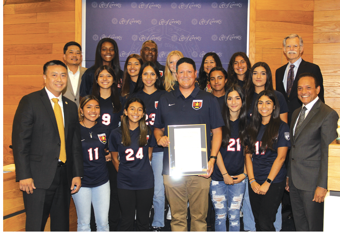 THE CERRITOS UNITED BLUE GIRLS soccer team was honored by the Cerritos City Council for being named the 2022 Cal South National Cup Champions. The team, which competed in Boise, Idaho, was undefeated during group play and the elimination rounds. Led by head coach Santino Prado, the team consists of: Aaliyah Young, Alexis Santillan, Belinda De Anda, Brisa Mariscal, Camila Montes, Camila Perez, Citlaly Rivera, Emily Rodriguez, Gianna Friedman, Jessica Orozco, Katelyn Vargas, Kennedy Justin, Kyra Hamilton, Naomi Zamora, Samantha Aguila and Beth Soria.
