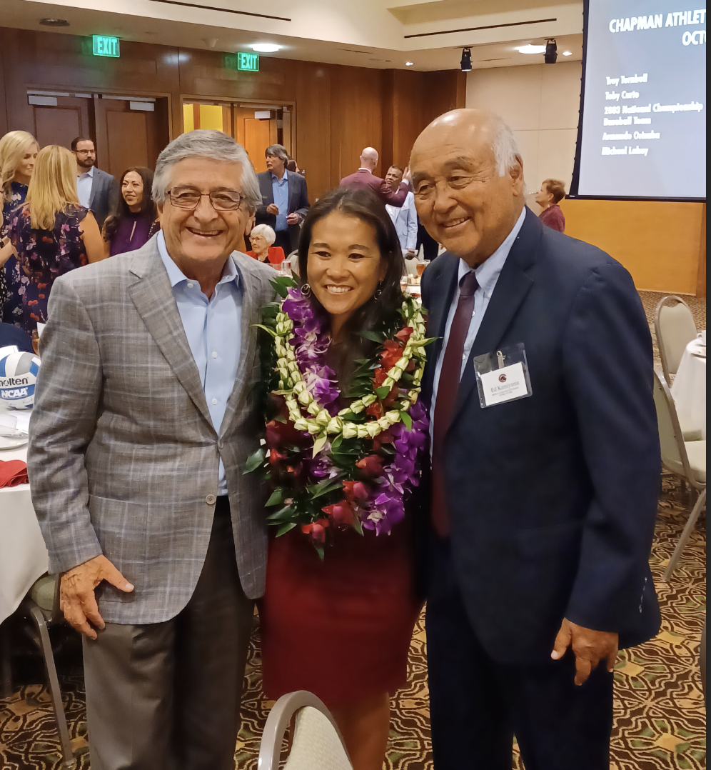 Lauren Kamiyama, who recovered through three torn ACL’s, the last when she was a sophomore at Chapman University, is pictured with her chiropractor Carlos Prieto (left) and her father, Ed Kamiyama last Friday night as Lauren was inducted into Chapman’s Hall of Fame.