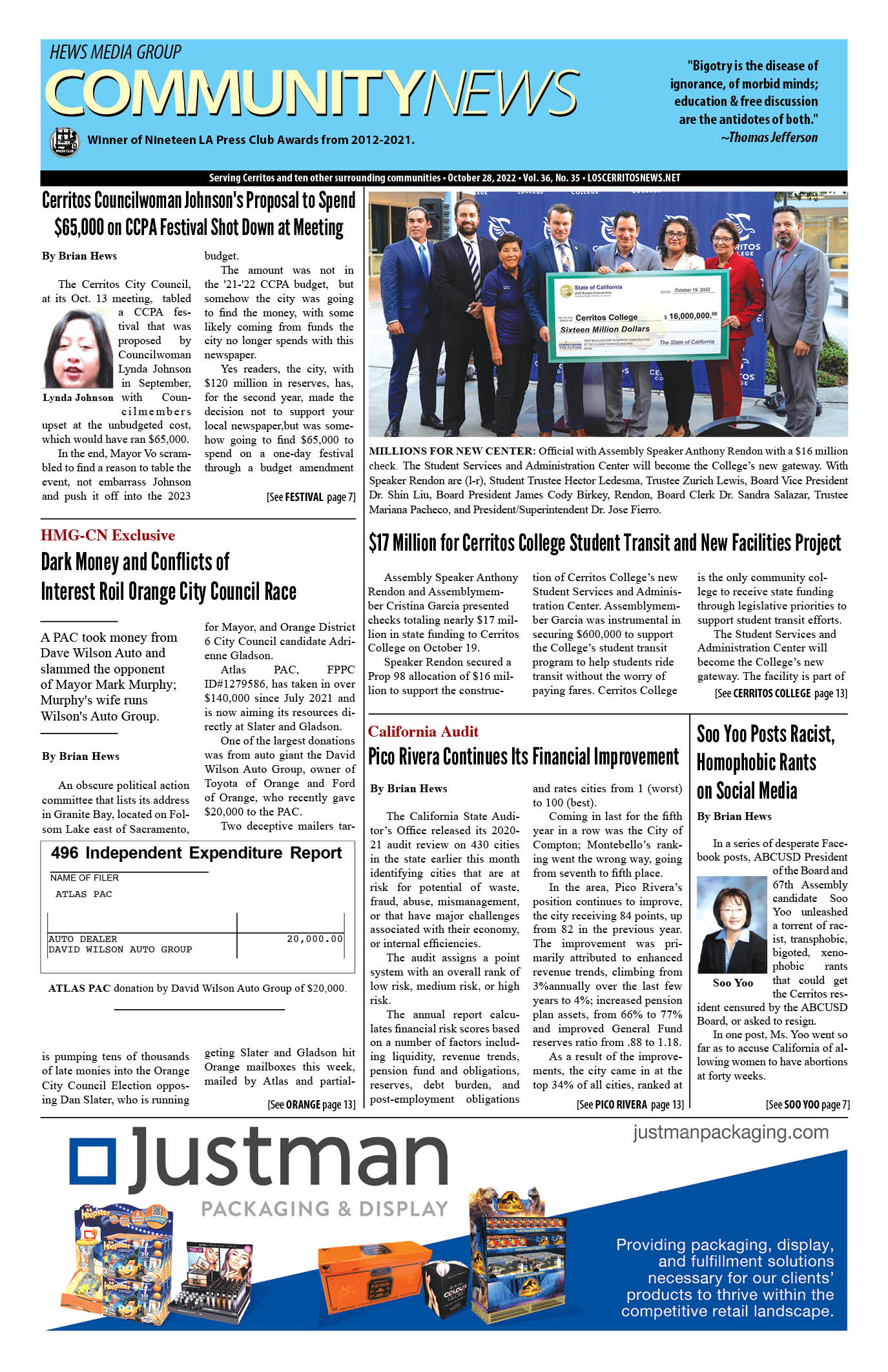 Award-winning HMG-CN is a  hyper -local community news and investigative reporting print newspaper in Los Angeles and Orange Counties.  Covering Cerritos, Artesia, Hawaiian Gardens, Lakewood, Norwalk, La Mirada Lamplighter Community Newspaper, La Palma, Commerce, Downey, Bellflower, Pico Rivera.