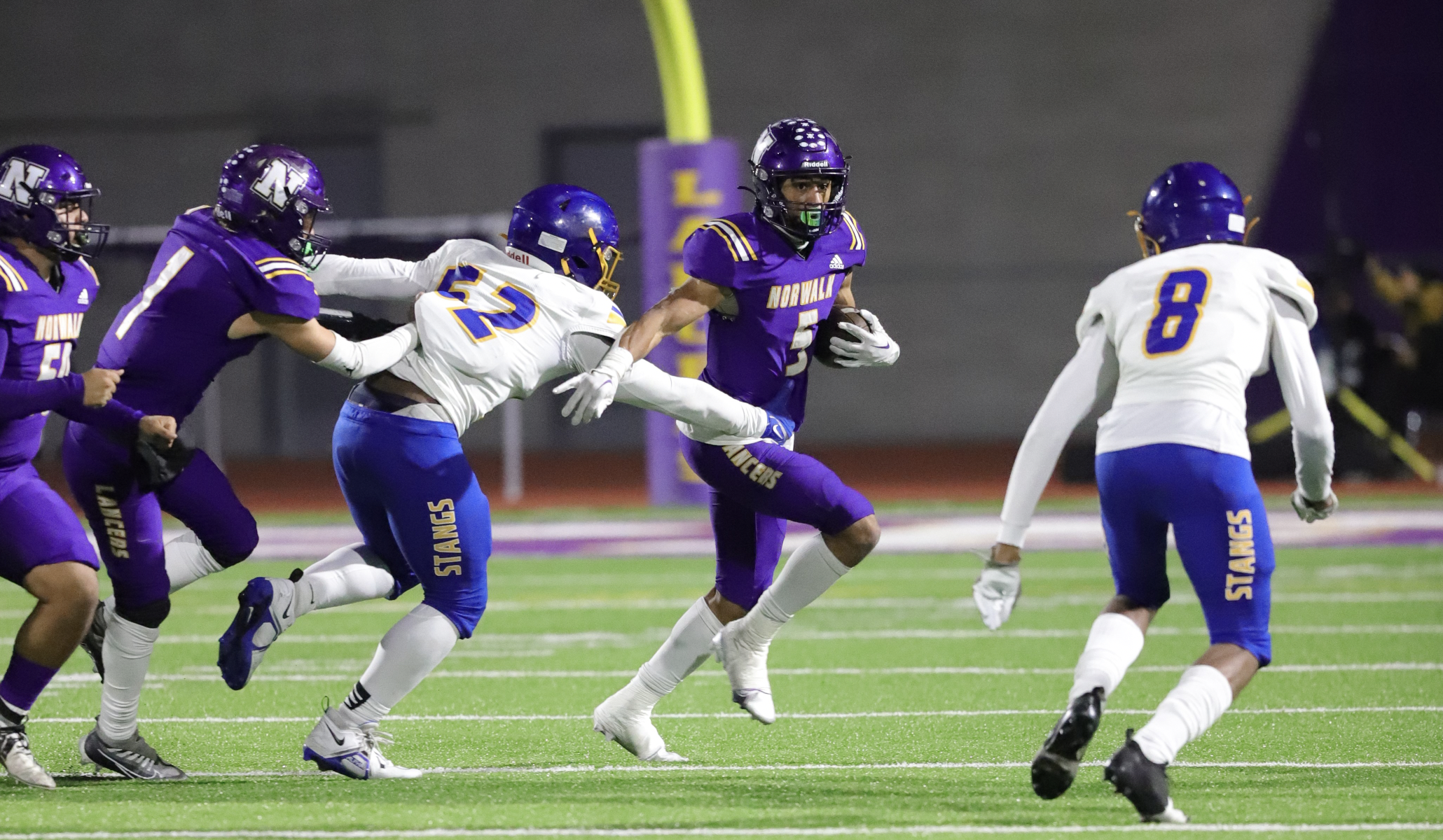 Muir got the ball to begin the game and went 63 yards in 3:16, ending in a two-yard scoring run from Jachai Pulley. After that, both defenses would control the rest of the first half. The Mustangs punted on their next drive, then ran two plays in the second quarter while Norwalk, the tri-champions of the Mid-Cities League, was stopped on downs in its first drive, which lasted almost six minutes.