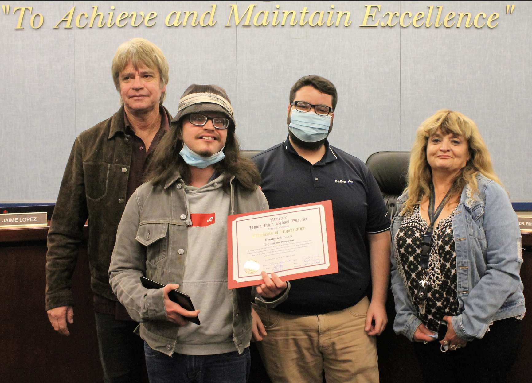 For his progress and tremendous growth, Fred was recognized by the Whittier Union Board of Trustees with an Award of Merit during its Nov. 8 Board meeting. During the meeting, Fred used his communication device to thank the Board for the recognition. Whittier Union Transition teacher Darla Breiling, who joined Fred and his family, was effusive in her praise.