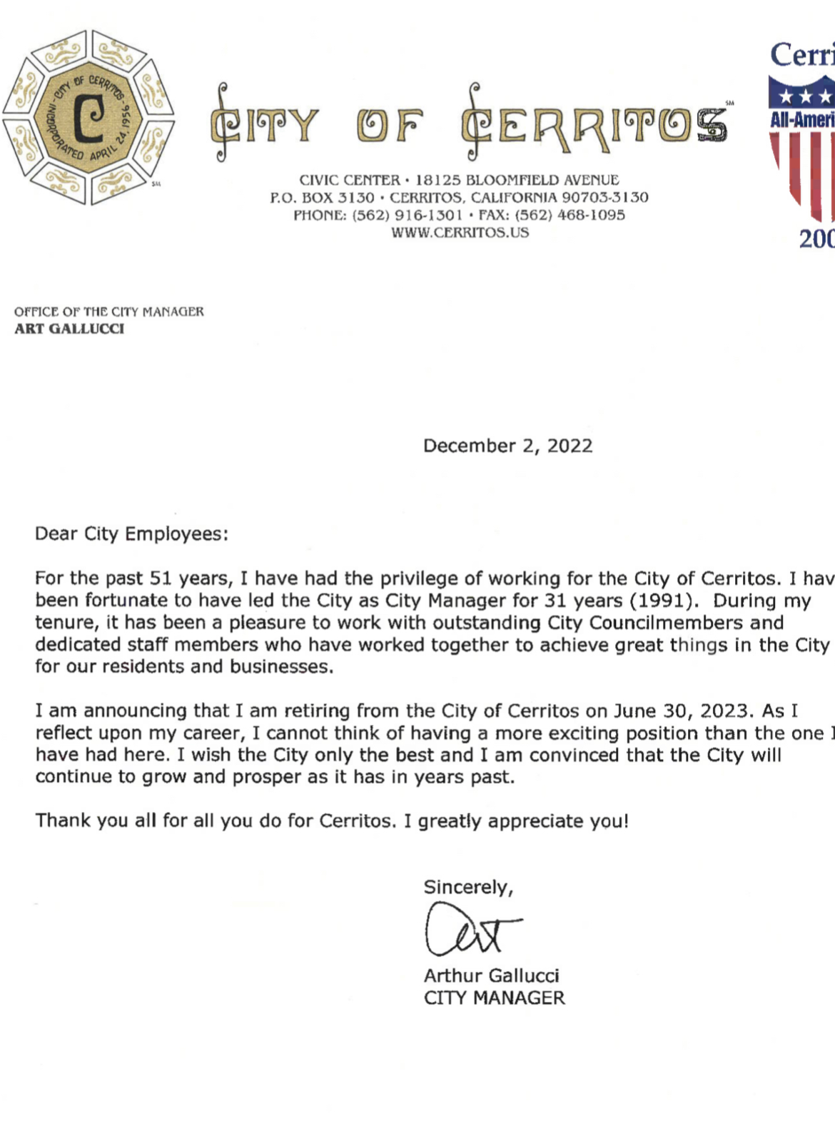 December 3, 2022 Hews Media Group-Community News has exclusively learned that longtime city manager Art Gallucci will be retiring in June 2023.