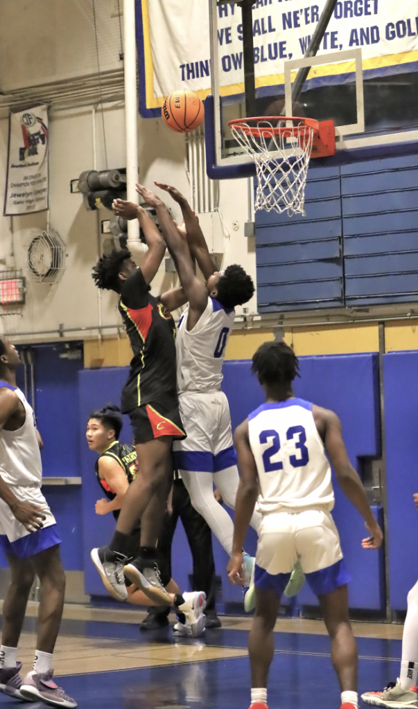Cerritos High junior Tobeanna Ozoagu (left) and Gahr High junior Evan Spurlin-Renfroe battle for a rebound in last Thursday night’s city rivalry game. Spurlin-Renfroe would have a lot to say in the outcome as his steal, offensive rebound from a missed shot and buzzer-beater basket, all in the final seconds of regulation, sent the game into overtime. From there, Gahr pulled out a 64-61 win. Photo by Armando Vargas, Contributing photographer.