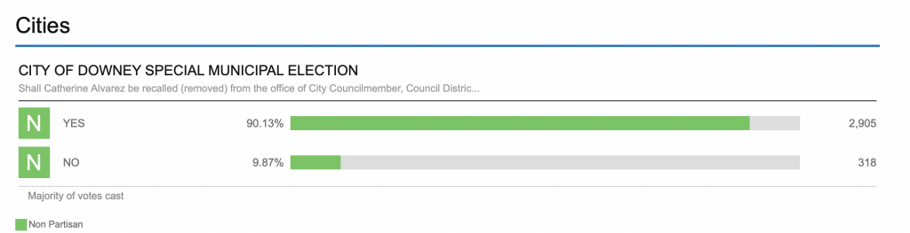 With yes to recall ahead by over 2,587, 90% YES, 10% NO, it looks like embattled Downey Councilwoman Catherine Alvarez will be recalled.