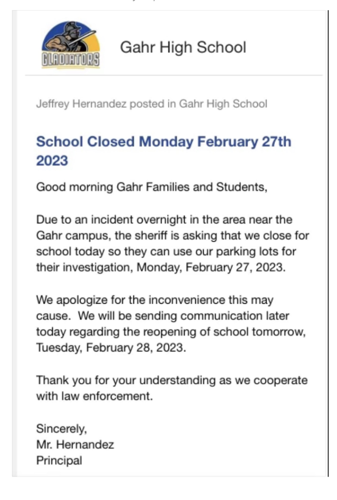 A deadly car-to-car shooting early Monday morning led investigators to a Gahr High School parking lot, prompting the school to close the campus.