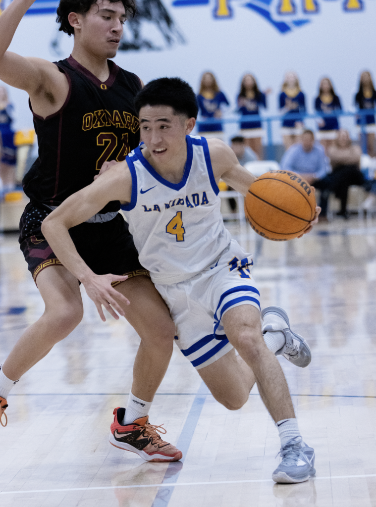 La Mirada High senior Sean Cervantes drives around Oxnard High’s E.J. Gomez in the second half of last Thursday night’s CIF Southern California Regional Divisional 2 second round game. Cervantes scored a season-high 20 points but the Matadores came up short in a 61-58 contest, PHOTO BY ARMANDO VARGAS, Contributing photographer.