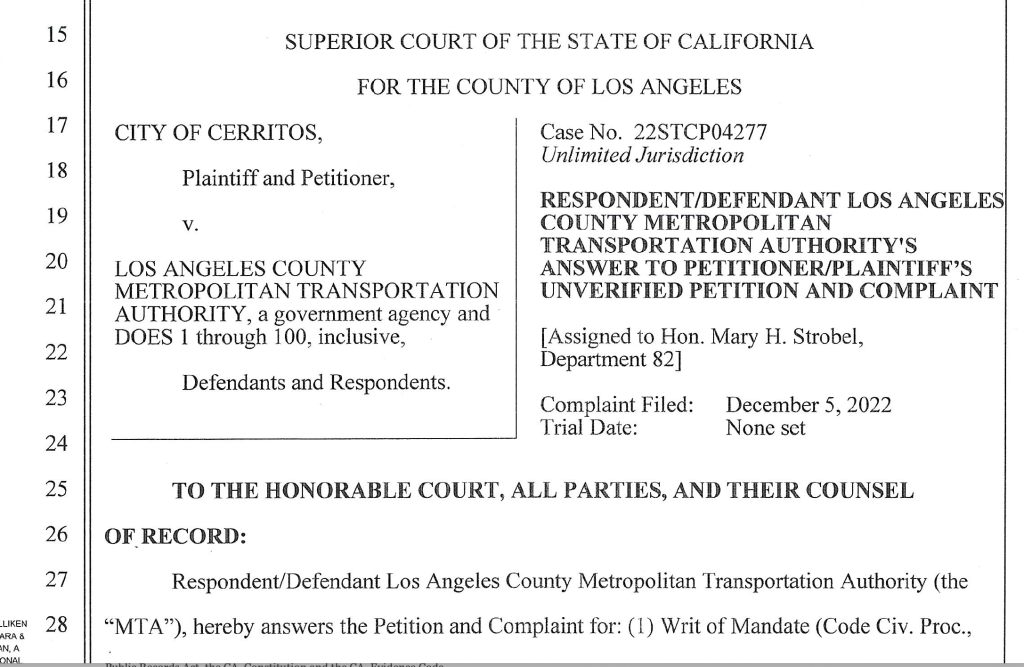 The response also affirmed Cerritos failed to state a cause of action, meaning Metro is questioning the legal basis for the lawsuit.